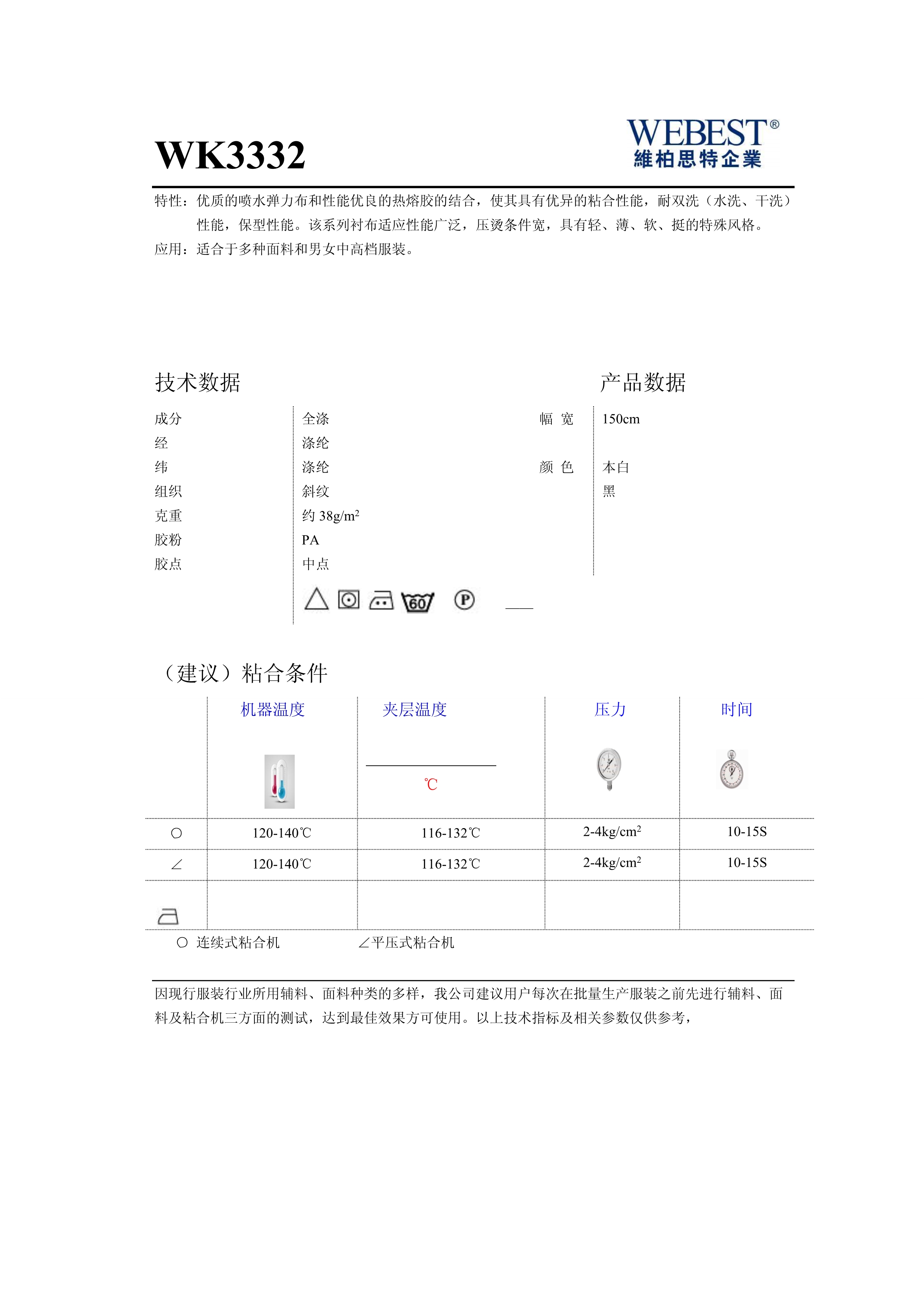 | WK3332 | 38 | 全滌 | 斜紋 | 150 | 黑,本白 | |