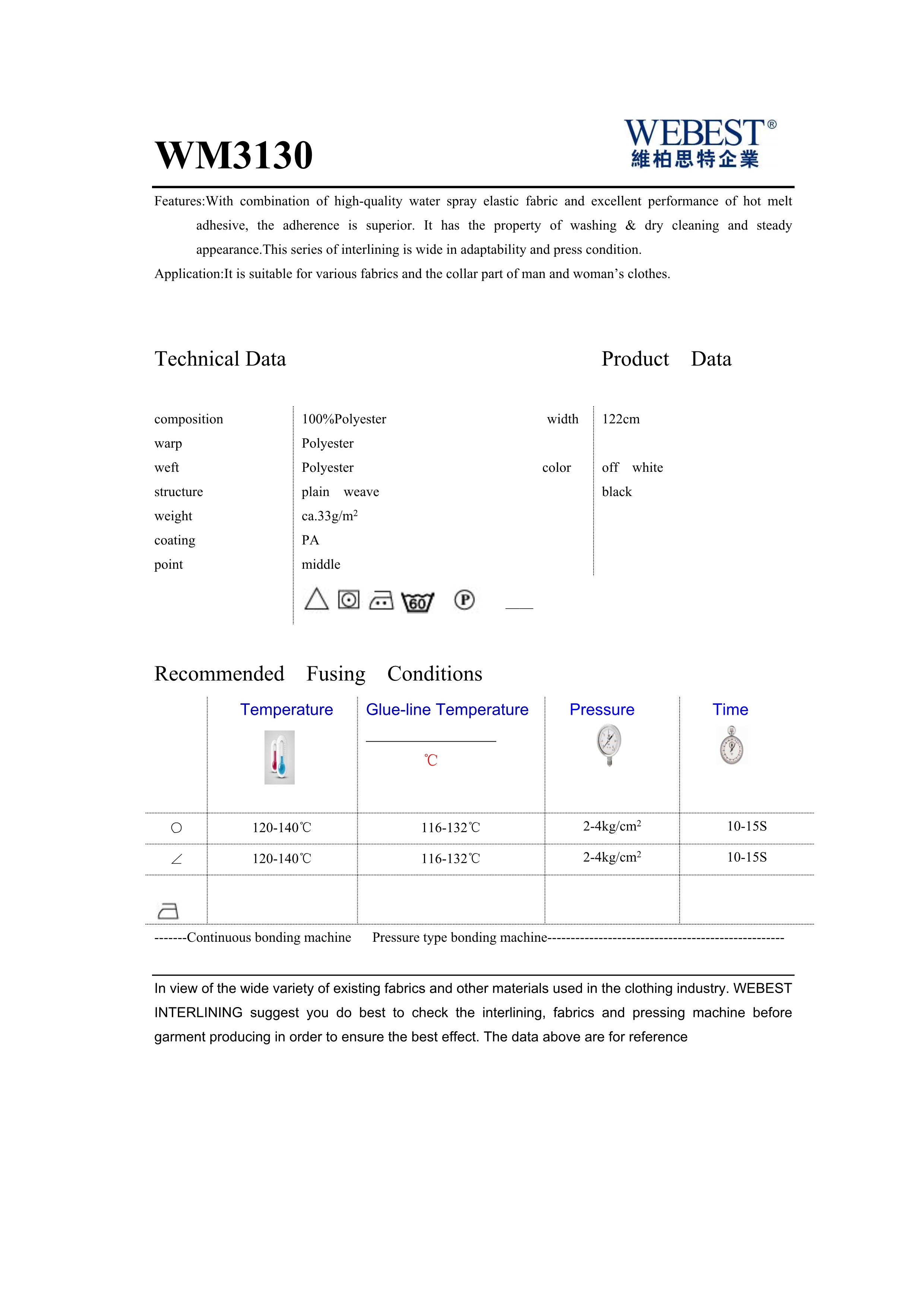 | WM3130 | 33 | 100%PES | plain weave | 122 | black,off white | |