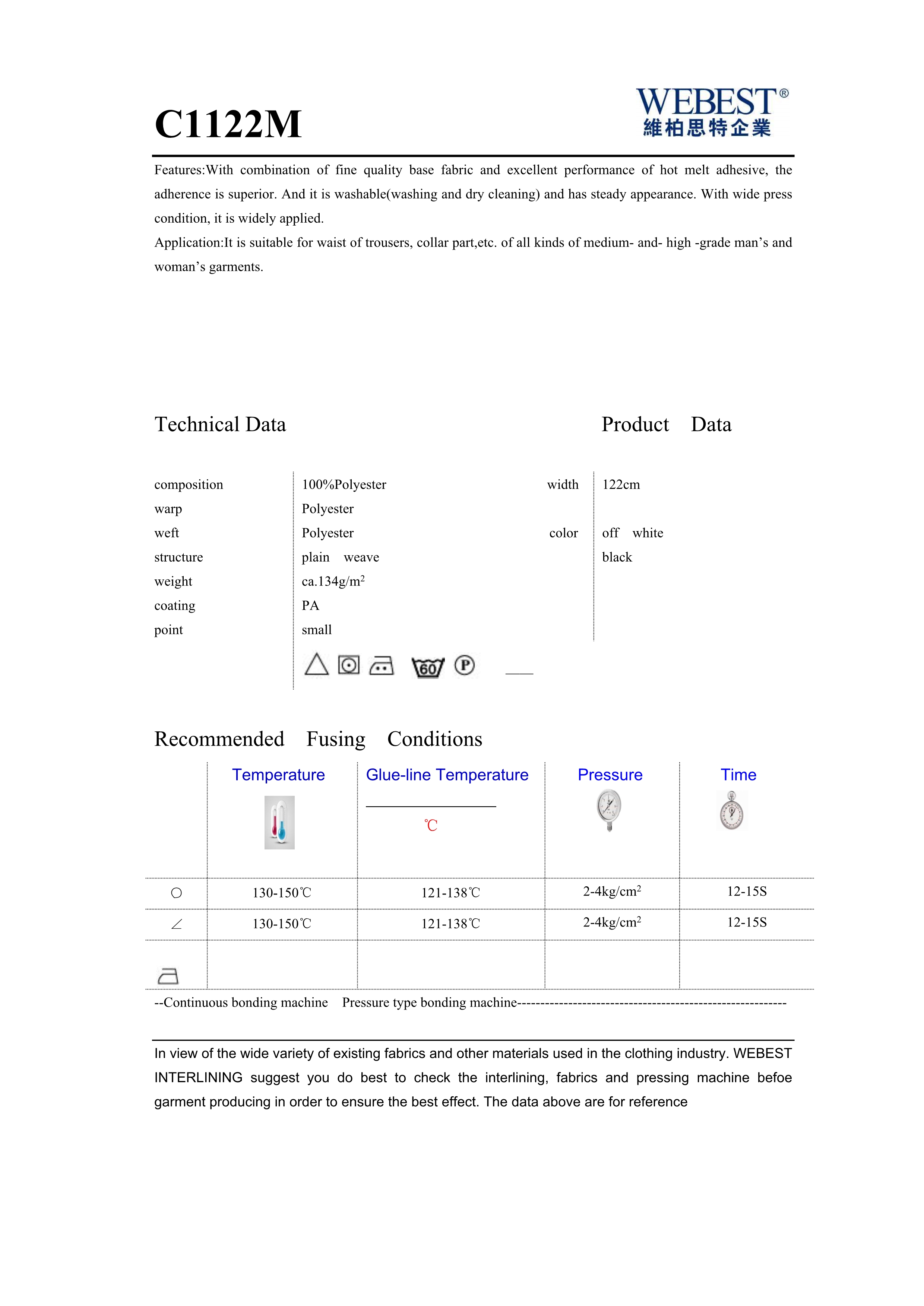 | C1122M | 134 | 100%PES | |